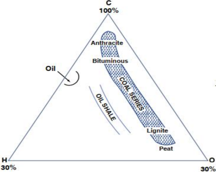 석탄과 석유는 구성 성분에서 차이가 난다. 모든 석탄과 석유에 해당하는 내용은 아니지만 대체로 석탄은 석유에 비해 이종원소의 함량이 높고 H/C 값이 낮다. 이유는 석탄은 고리 모양의 방향족 성분을 많이 포함하고 있기 때문이다.
