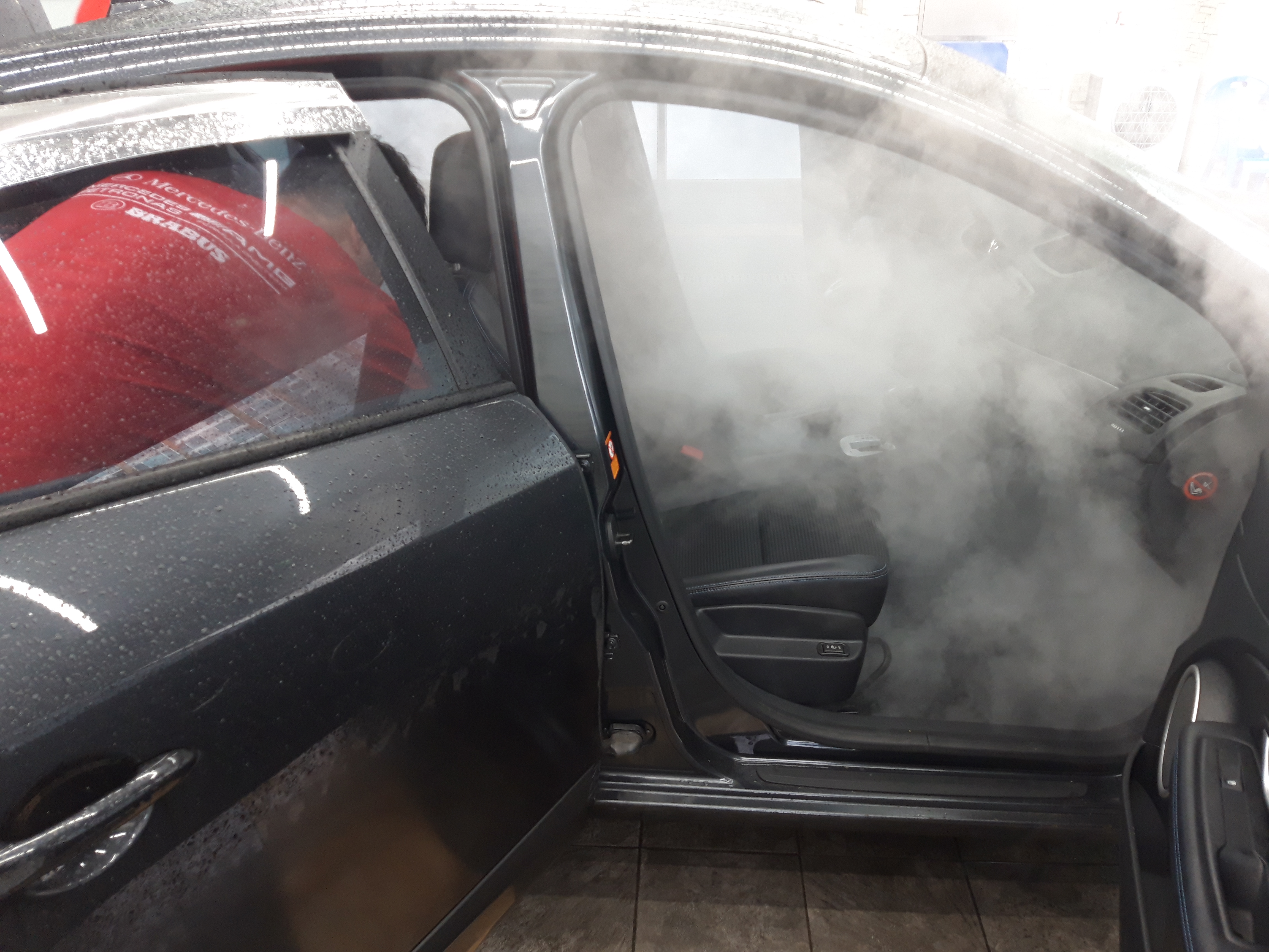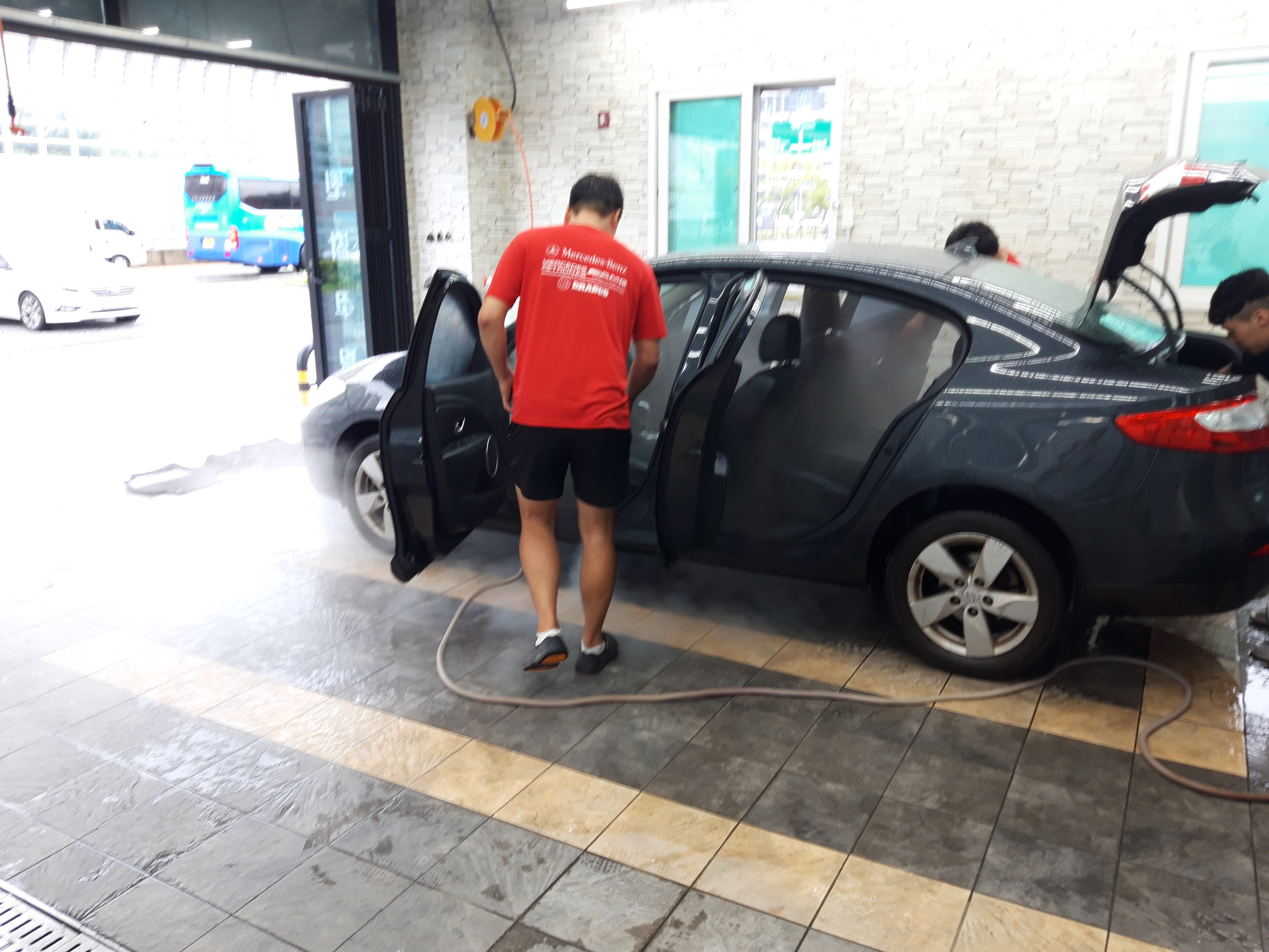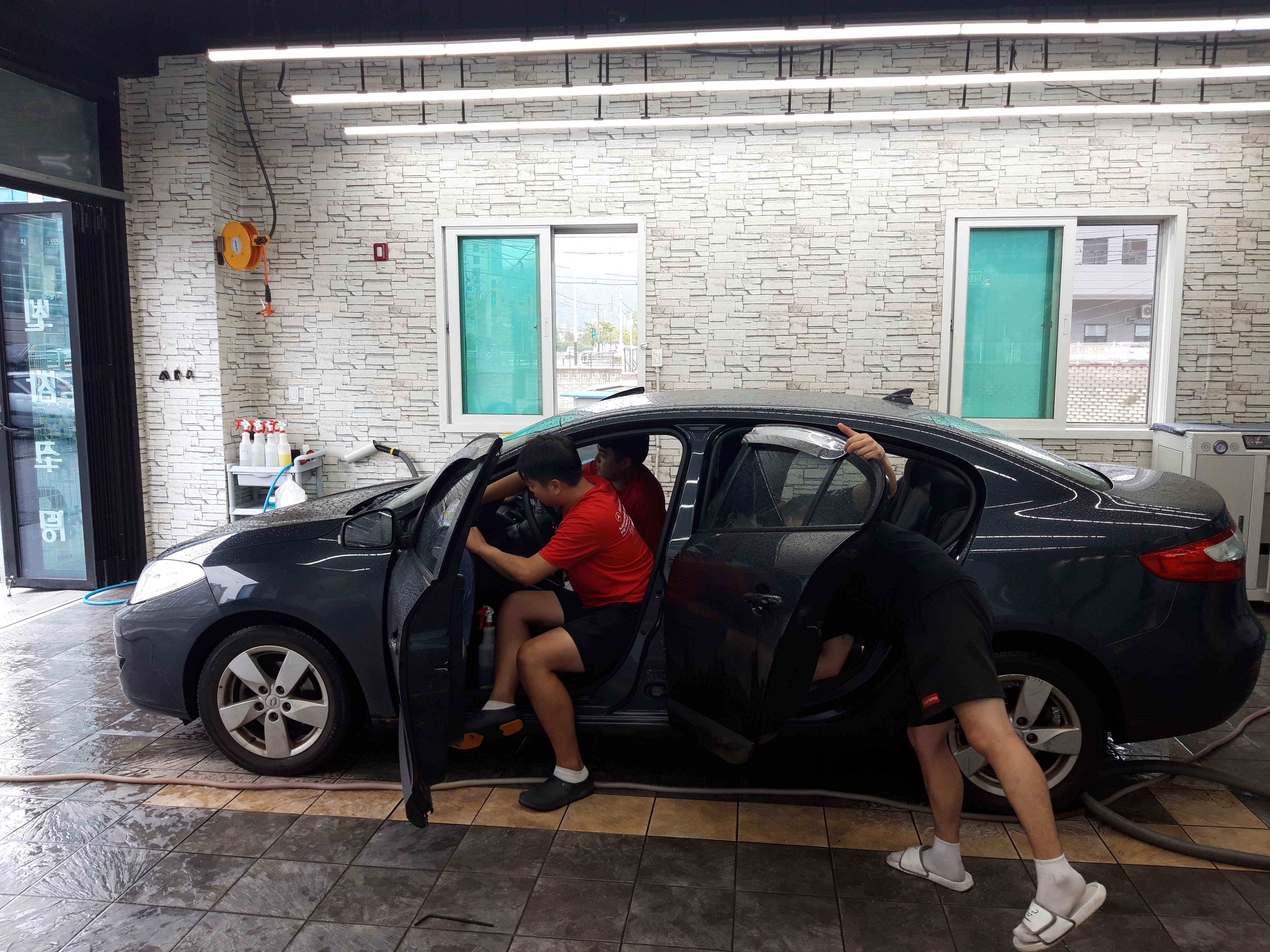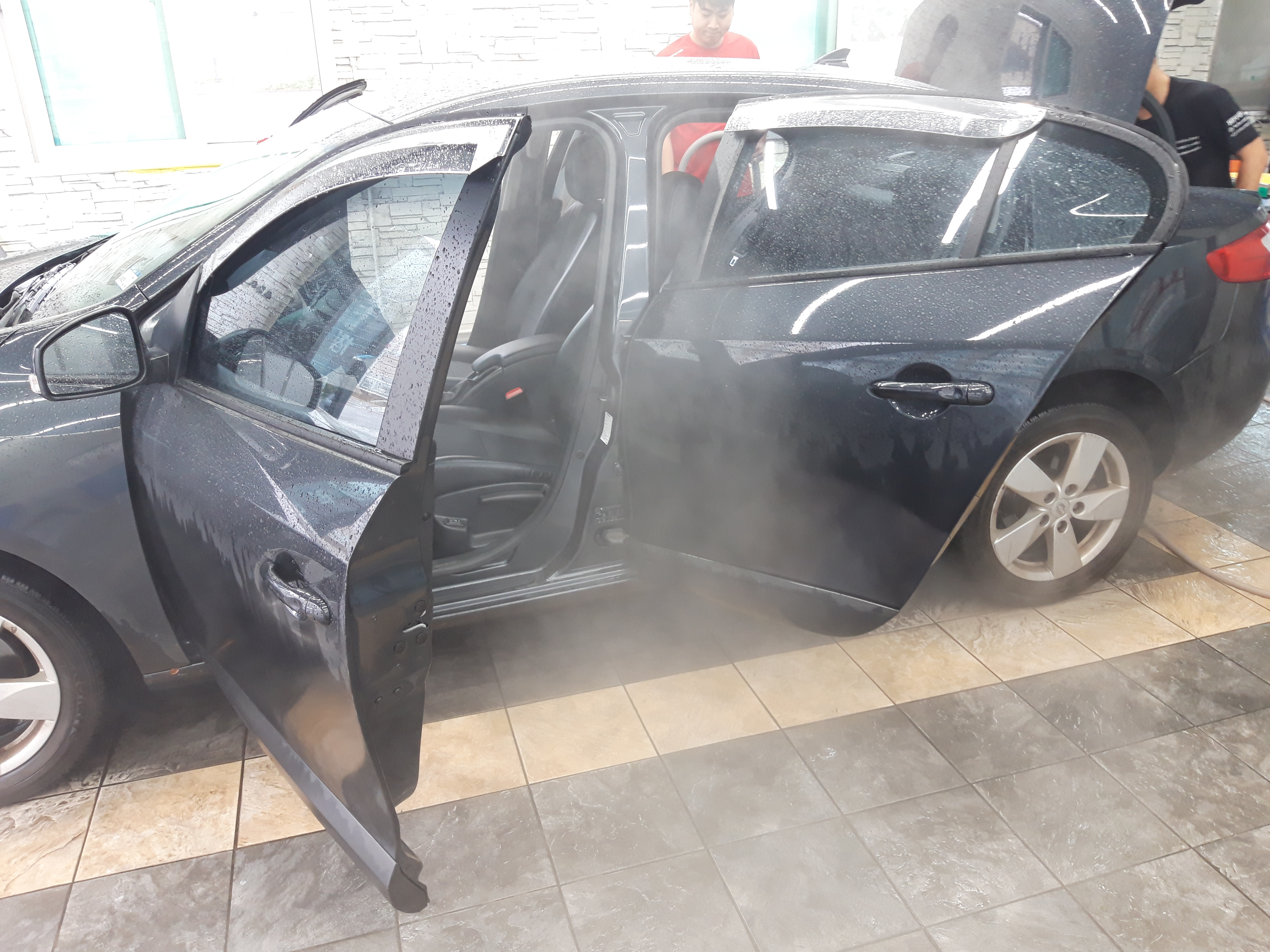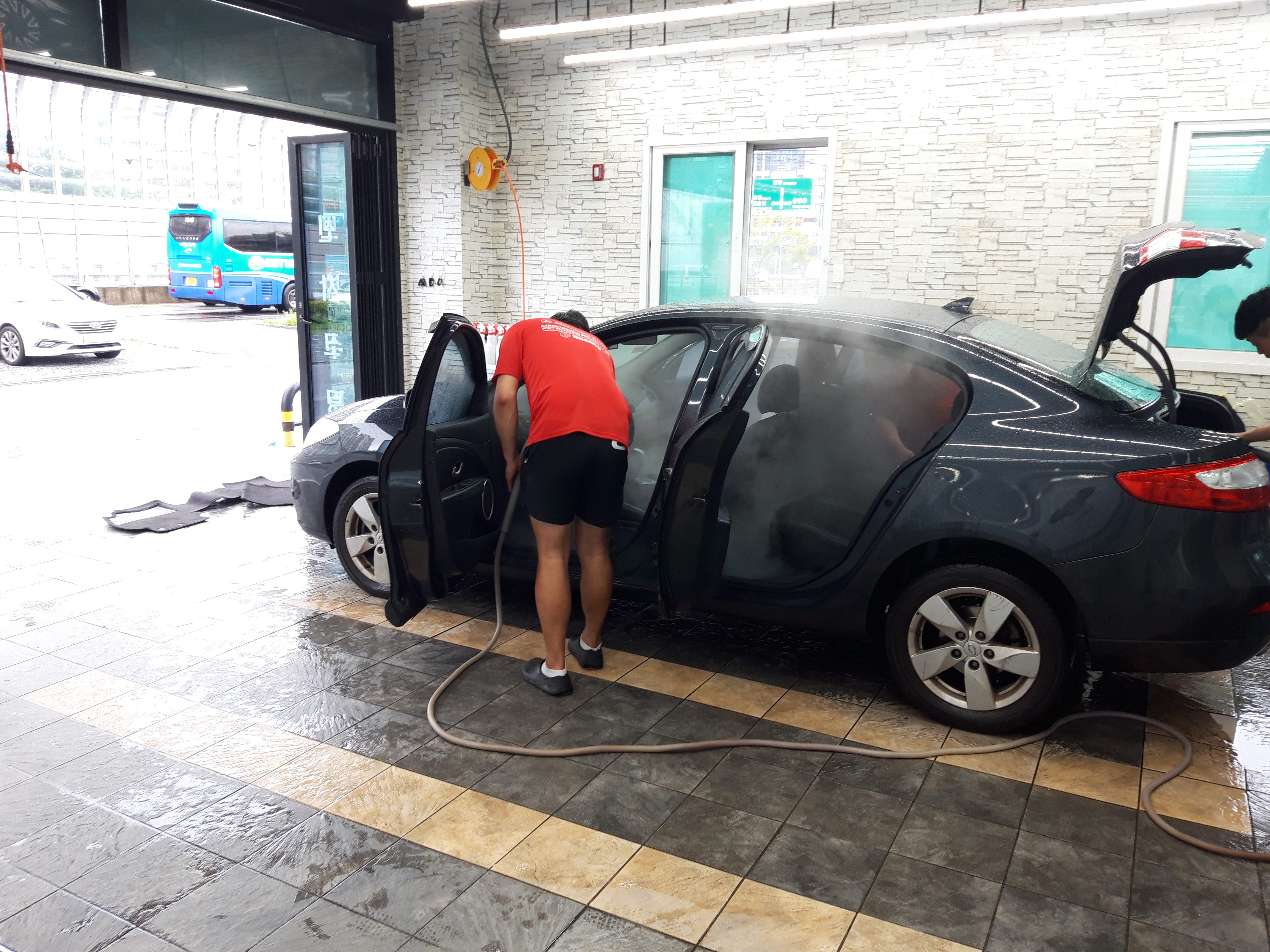 세차는 스팀과 청소기를 이용해서 진행하더라고요. 그런데 세 사람이 붙어서 자동차 안의 짐을 다 빼고, 스팀과 청소기를 이용해서 청소하니까 금방 다 끝났습니다. 2~30분 정도 걸렸던 것 같아요