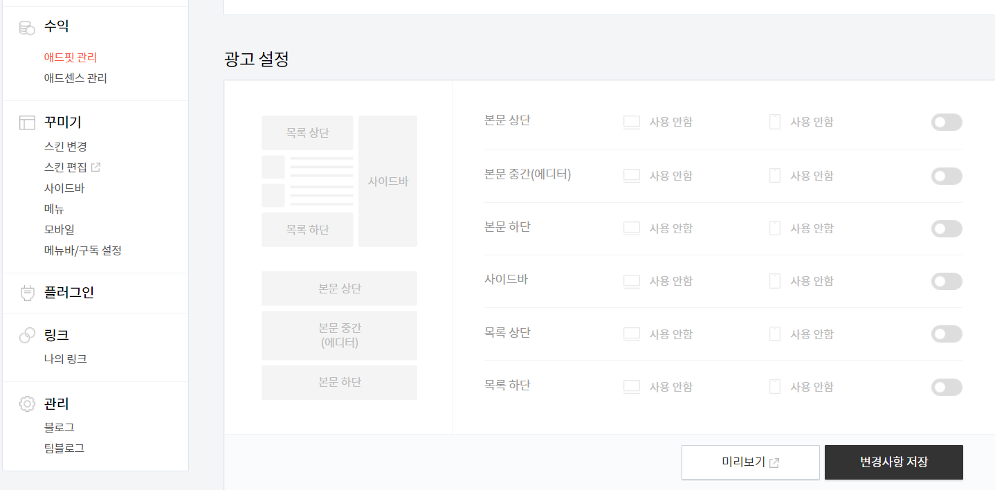 티스토리 메뉴 중 수익 칸에 애드핏 관리라는 게 새로 생겼네요