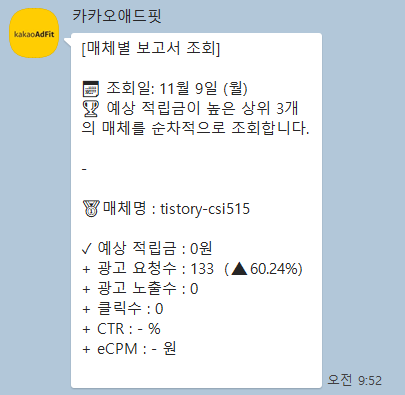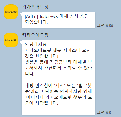 오늘도 어김없이 회사에서 근무하고 있었는데, 낯선 카톡이 왔어요. 열어보니 카카오 애드핏에서 심사 승인됐다는 메시지였어요.