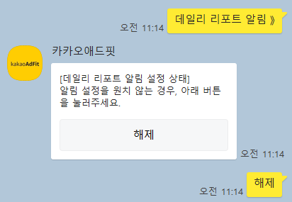하루에 한 번씩 오는 이 알람이 귀찮으시면 언제든 간단하게 챗봇으로 해제할 수 있어요. 전 아꼈다가 수익 확인하고 싶어서 데일리 리포트를 켰다가 기능만 보고 다시 해제했어요^^