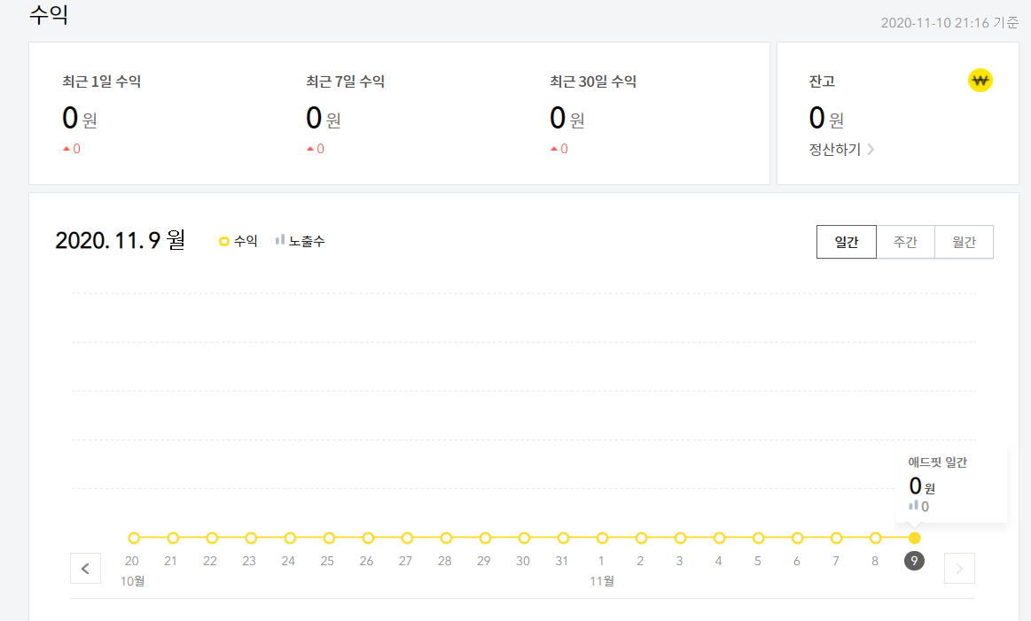 광고를 게시하지 않았으니 수익도 당연히 0이네요 ㅎㅎ