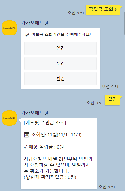 챗봇으로 알아볼 수 있는 내용들이 있어서 몇 가지 클릭해봤어요. 간단하게 적립금 조회를 눌러봤는데 역시 0원이네요 ㅋㅋㅋ