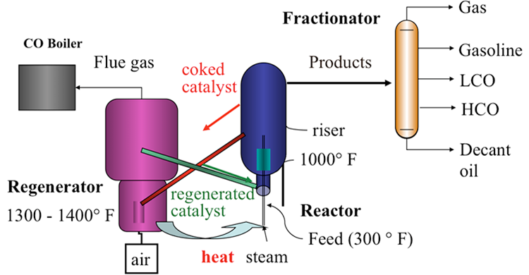 FCC는 고체산 촉매를 이용하여 상압 잔사유(AR)나 감압 경유(VGO) 또는 이들의 수소화 처리유(DSAR, DSVGO) 등 중질 유분으로부터 가솔린과 같은 저비점, 고부가의 탄화수소를 생산하는 반응장치다.