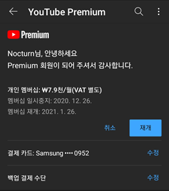 전 음악 듣는 앱으로 유튜브 프리미엄을 이용하고 있는데, 멤버십 결제일을 변경하려고 해요. 매월 말에 이용료가 결제되니까 신용카드 실적이 자꾸 과하게 초과돼서 관리하기가 번거롭더라고요.