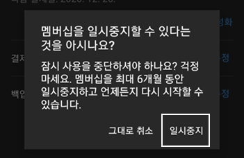 비활성화 버튼을 누르면 멤버십 일시중지 안내창이 뜹니다.