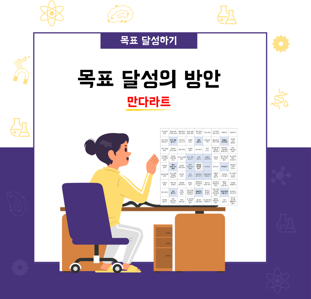 저는 당당한 연구원이 되기 위해 만다라트를 작성해봤는데요. 생각보다 칸 채우는게 쉽지 않았습니다. 하지만 한 번 노력해서 칸을 채우고나면 앞으로 행동방향을 보다 확실하게 정할 수 있어서, 목표를 이루는 데 있어 좋은 방법인 것 같습니다.
