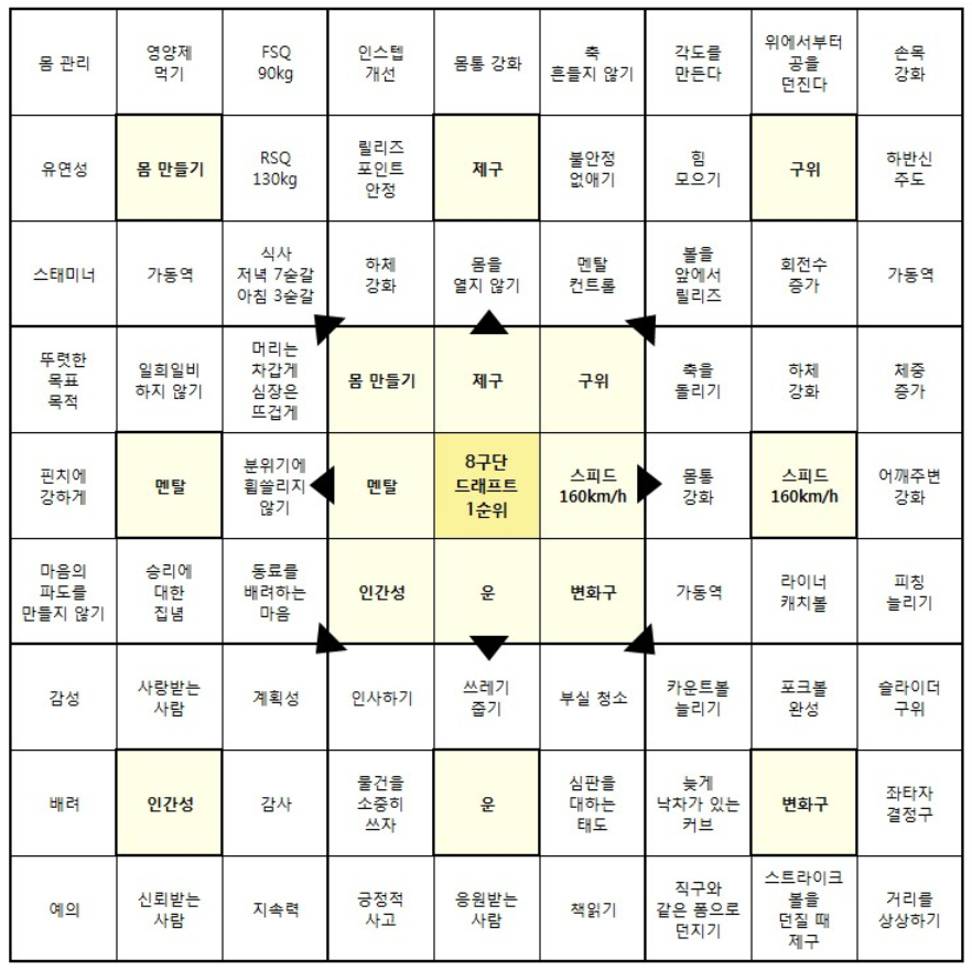 - 둘 째, 제일 가운데에 달성하고자 하는 목표를 적고, 그 주위의 8개 칸에 현실화 방안을 적습니다.